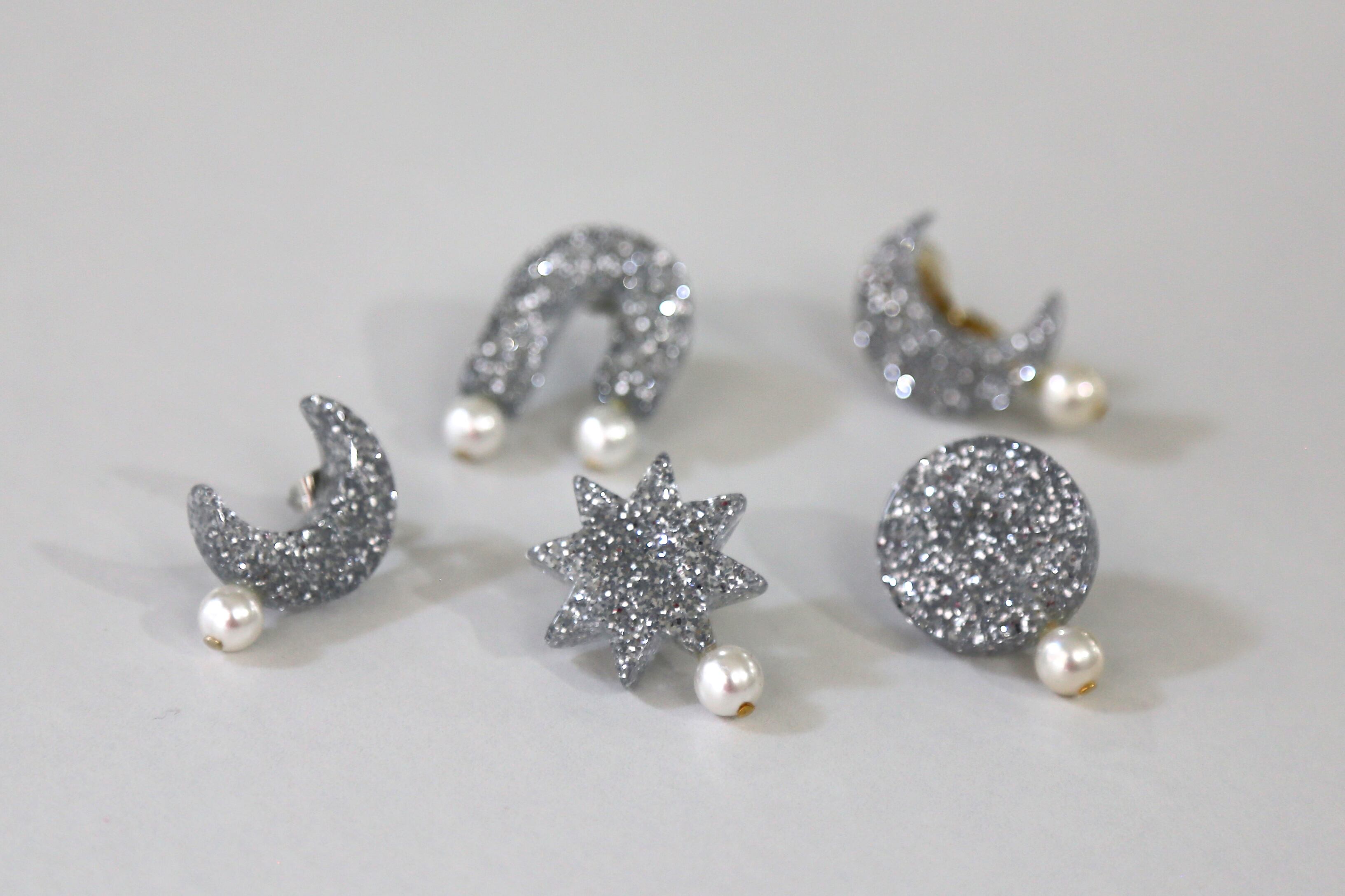EARRINGS【ER-048】CRESCENT MOON(右欠け) SILVER GLITTER ※片耳販売